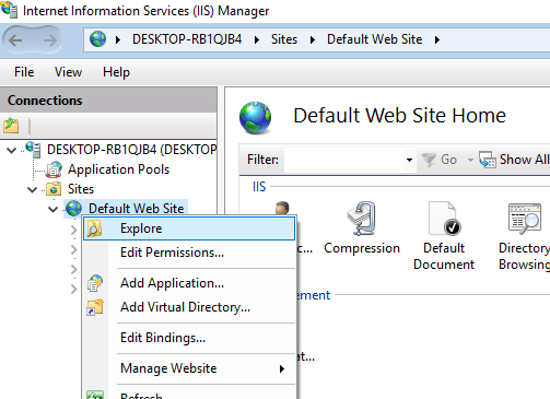 For this example we will look at the Default Web Site. In IIS Manager, right click on your Web Site and click Explore.